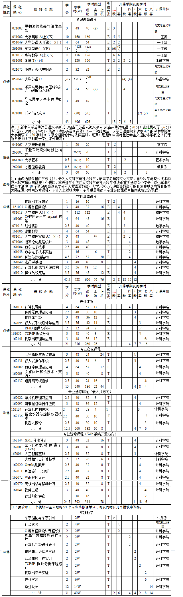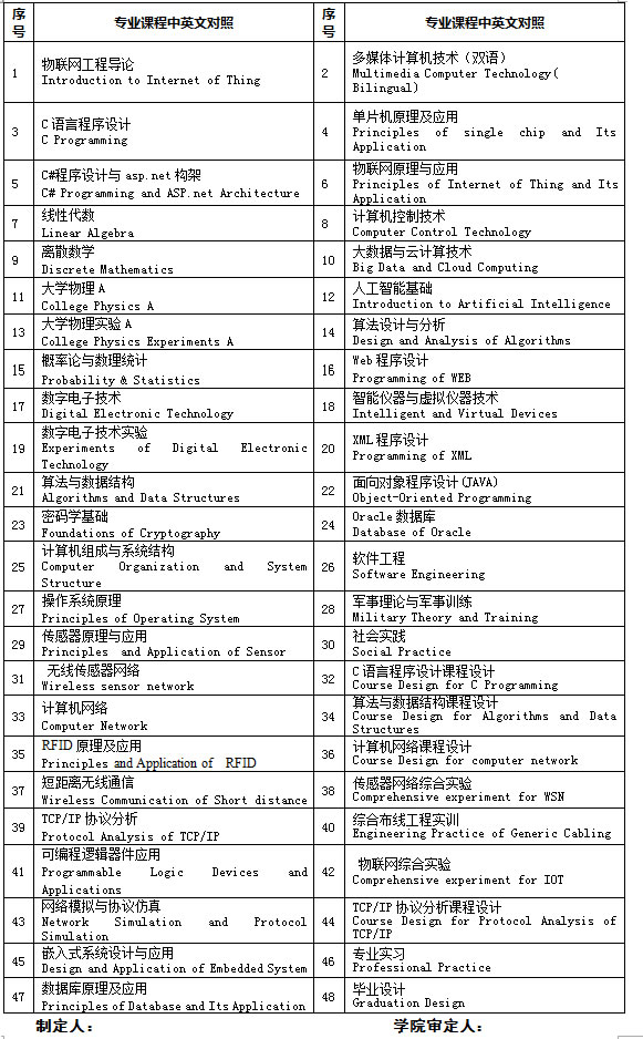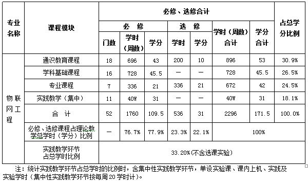 3.主要实践教学环节:军事理论与军事训练,社会实践,C语言程序设计课程设计,算法与数据结构课程设计,计算机网络课程设计,传感器网络综合实验,综合布线工程实训,TCP/IP协议分析课程设计,物联网综合实验,专业实习,毕业设计。