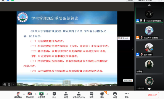 学籍管理》中部分内容做了详细解读。随后,颜书记又对学生来校途中及报到后在校期间的管理做出各项安全提示。会议议程第三项,学院2020级辅导员张颖旭针对学生返校前的准备工作及新生报到流程作出详细说明,并且对家长关心的宿舍问题,军训安排等做出详细解答。