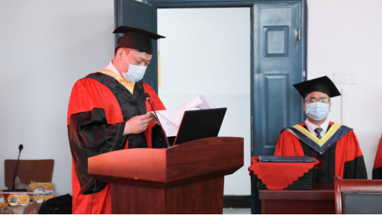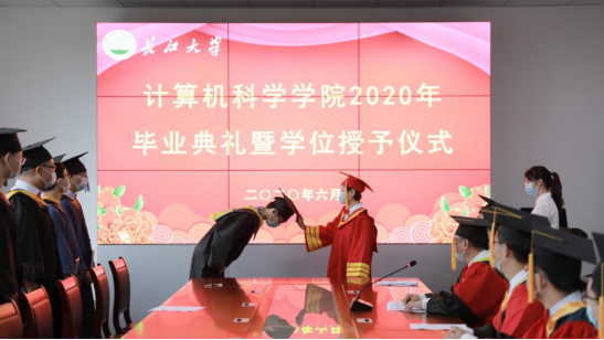 在5教501举行2020年毕业典礼暨学位授予仪式。学院院长崔艳荣,党委书记高明成,副院长向宇、詹炜、宋文广,党委副书记颜学俊,各系主任,全体辅导员及15名毕业生代表在现场参加毕业典礼。根据疫情防控要求,今年毕业典礼采取线上线下相结合的方式,未到现场的师生也通过腾讯会议参加了典礼。