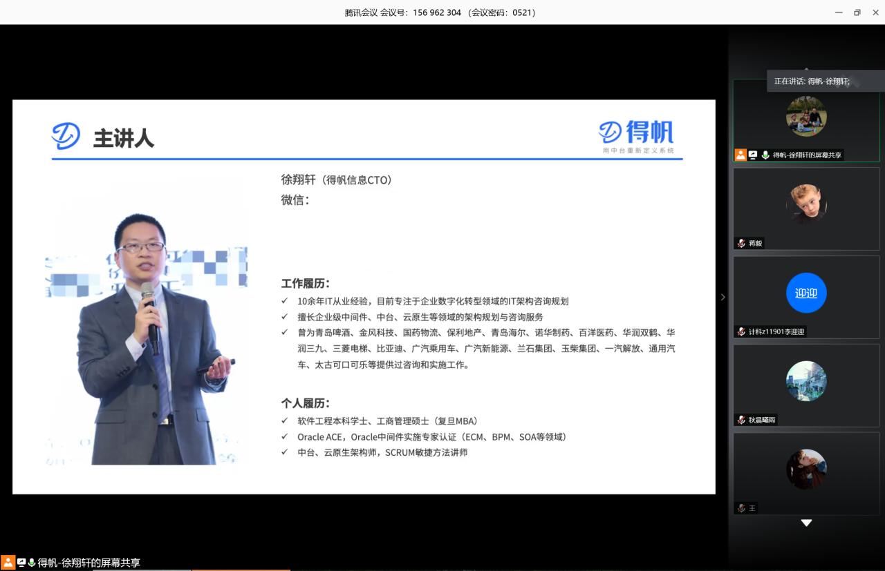 利用腾讯会议组织开展了就业指导线上讲座。此次讲座邀请到上海得帆信息技术有限公司首席技术官(CTO)徐翔轩先生担任主讲嘉宾,由就业专干蒋毅老师主持,学院2016级、2017级同学积极参与、即时互动。