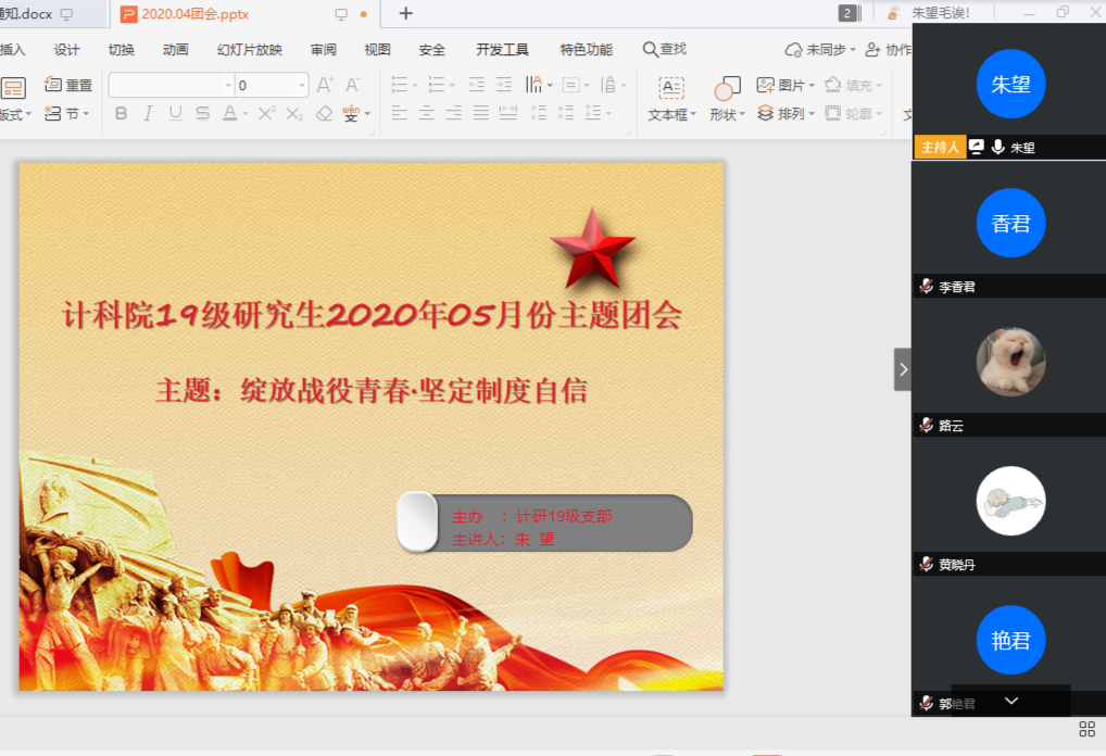 在5月以团支部为单位召开了“绽放战役青春·坚定制度自信”为主题的团会活动,活动时间为5月1日到5月18日。