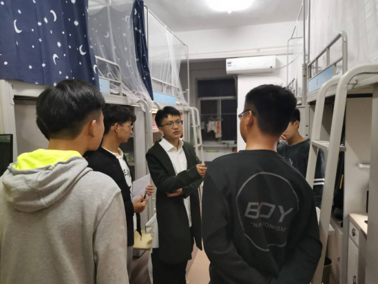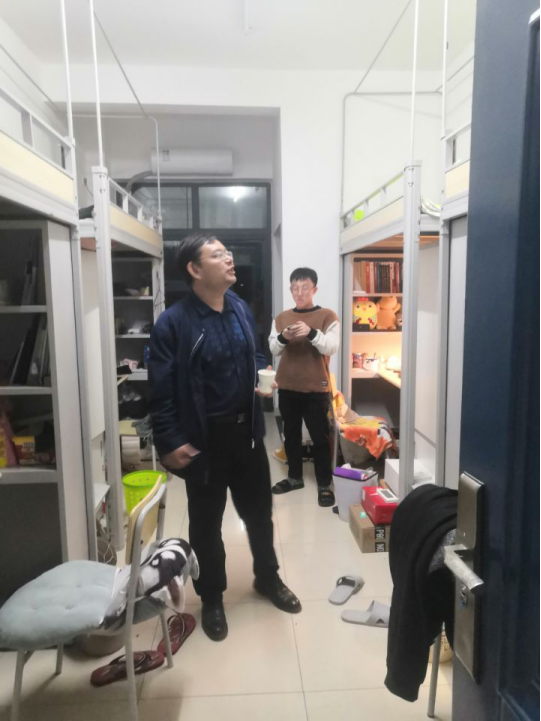 全体辅导员在颜学俊副书记带领下检查学生寝室,了解学生学习生活情况,提醒学生注意用电安全。