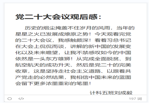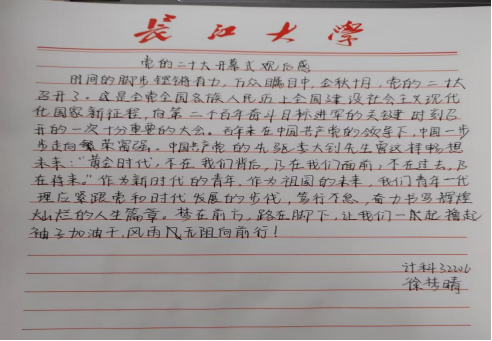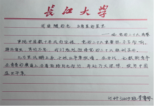 在会议结束后,22级李睿姝同学发表感言:我追寻的光,五角星的光芒。刘成毅同学感慨到:我相信中国未来的蓝图会留下更多浓墨重彩的笔墨。徐梦晴同学对未来充满希望:梦在前方,路在脚下。我们青年一代理应紧跟党走,跟着时代发展的步伐,笃行不怠,奋力书写辉煌灿烂的人生篇章。
