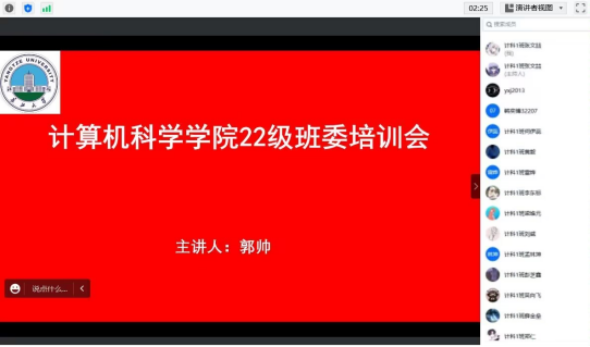于12月1日中午12点通过腾讯会议召开了2022级班委培训大会。出席此次会议的有辅导员郭帅以及全体22级班委。