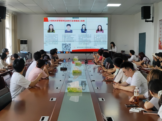 23届团委学生会执行主席王晓森对2023-2024年学生会的工作进行了汇报,他向同学们先简要介绍了学生会各部门职责情况,总结了这一年以来学生会所举办的活动并指出了当前存在的问题和挑战,也表达了对学生会未来的规划。随后,22级研究生贾瀛睿对研究生会工作进行了汇报,介绍了研究生的政治理论学习模式、研究生会举办的体育活动,她希望以后能有更多的人参与进来,将研究生会越办越好。