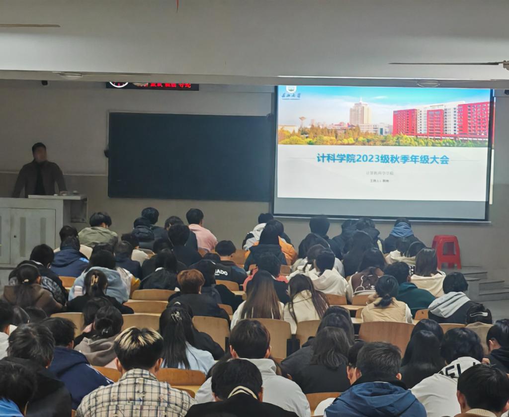 在12教201、202举办了一次针对2023级学生的年级大会,旨在提高安全防范意识、预防电信诈骗,并为学生未来规划提供指导。会议由年级辅导员郭帅、王鹏翔主持,吸引了558名学生参与。