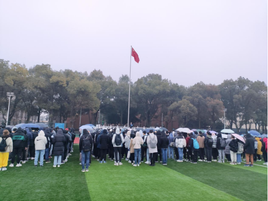 本次升旗仪式共分为升国旗、学生代表发言、教师代表发言三个环节。仪式第一项,升国旗奏国歌。当一切准备就绪后全场肃静,蒙蒙细雨中,国旗护卫队队员们迈着矫健的步伐护送鲜艳的五星红旗缓缓走来。当雄伟庄严的国歌奏响,五星红旗冉冉升起,迎风飘扬,全体师生心潮澎湃唱响国歌,向国旗行注目礼。