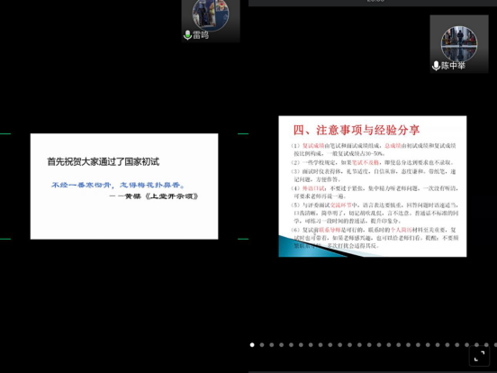 首先,雷鸣老师给大家分享复试经验。雷老师用“知己知彼,百战不殆”这句名言概括了复试流程。“知己”也就是自己做好充分准备,充分了解自己的强项和不足,学会推销自己;“知彼”则是摸清复试情况,心中有数才不慌。随后,陈中举老师给大家提醒了复试应注意的三大环节:笔试、面试和体检。陈老师着重强调了复试的一个小技巧——提前准备好一份简历,具体包括大学期间的自身项目经历、课程设计、自编程序、证书、获奖情况等等,这能够给复试评委留下很好的第一印象。王同喜老师则从充满信心、充分准备、注意事项和常见提问四个方面为同学们解读了考研复试。信心比黄金都重要,但信心不等于盲目自信,信心源于充分的准备。初试是高分,有起步优势,但不可懈怠;初试压校线,有翻盘可能,能后来居上。并且,王老师列举了几个经典的面试题给大家传授回答技巧。接着,白凯老师给同学们讲解了考研调剂事项。如果学生初试成绩与理想院校有差距,要立刻准备调剂,有研要读。一是积极打听自身排名,以免耽误调剂最佳时机;二是广泛撒网,多找机会,多收集调剂信息;三是主动出击,电话联系招办老师;四是多项选择,时刻保持联系。白老师也寄语大家,研究生不是终点,未来还有很长的路要走。