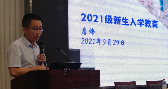 会议的第二部分,由副院长詹炜作新生入学教育报告。詹院长通过风趣幽默的开场白活跃现场气氛,从“爱学分,爱活动,爱集体”三部分,分别讲述人才培养计划、综合素质培养以及学生日常选课等内容,并呼吁大家做好班风学风建设。