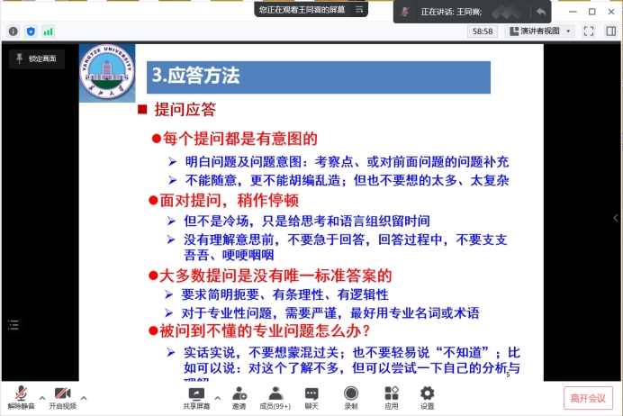 随后,软件工程系主任王同喜老师从五个方面进行拓展——充满信心、充分准备、应答方法、常见提问、注意事项,内容囊括了复试的各个环节,并强调大家需要调节好自己的心态来应对复试。