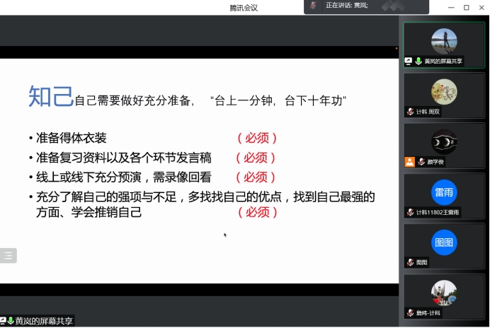 会议开始,计科系主任雷鸣老师、副主任黄岚老师,从“知彼”“知己”“战”“胜”四个方面出发,和大家交流了研究生复试前后必须注意的相关细节。