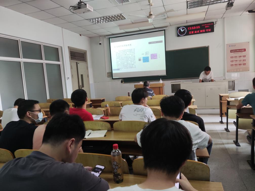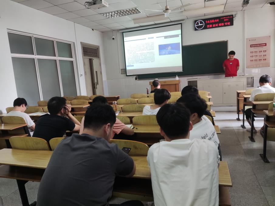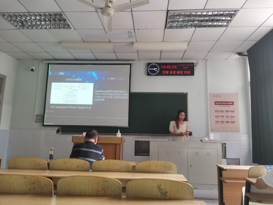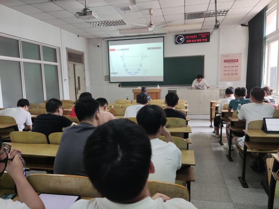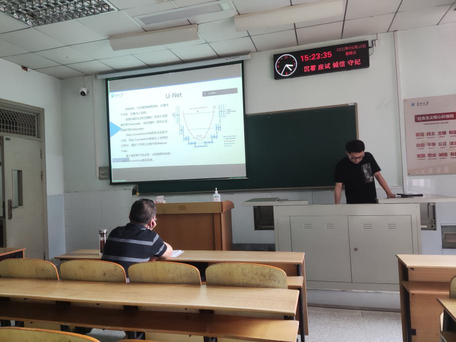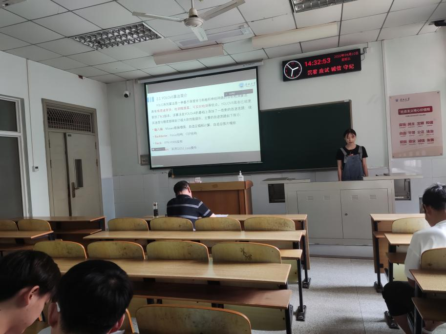 8位研究生依次登台演讲,分别围绕各自的研究方向,为同学们分享了8个课题:基于GAN的番茄病虫害图像数据增强方法研究、特征压缩激活作用下U-Net网络的煤尘颗粒特征提取、YOLOV5算法改进、基于YOLOV5的钢材表面缺陷检测算法、基于检索与生成对话模型的深度融合、可预测链路可靠性协议的卫星通讯技术研究、小样本语义分割的方法与应用、Multi-scale feature fusion Change Detection model等内容。学术论文报告会已经成为同学们知识共享和传播的一种重要方式,在演讲过程中,导师与听众和演讲人针对相关研究成果互动、探讨。每名研究生演讲完后,两位导师从全方位对演讲学生的汇报进行仔细点评,对其研究内容可能遇到的科研困难进行指导,通过点评有效促进了研究生的成长。