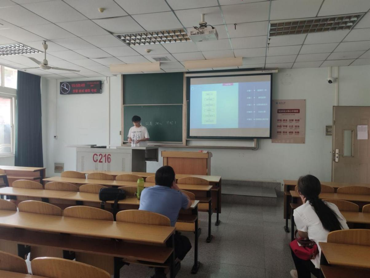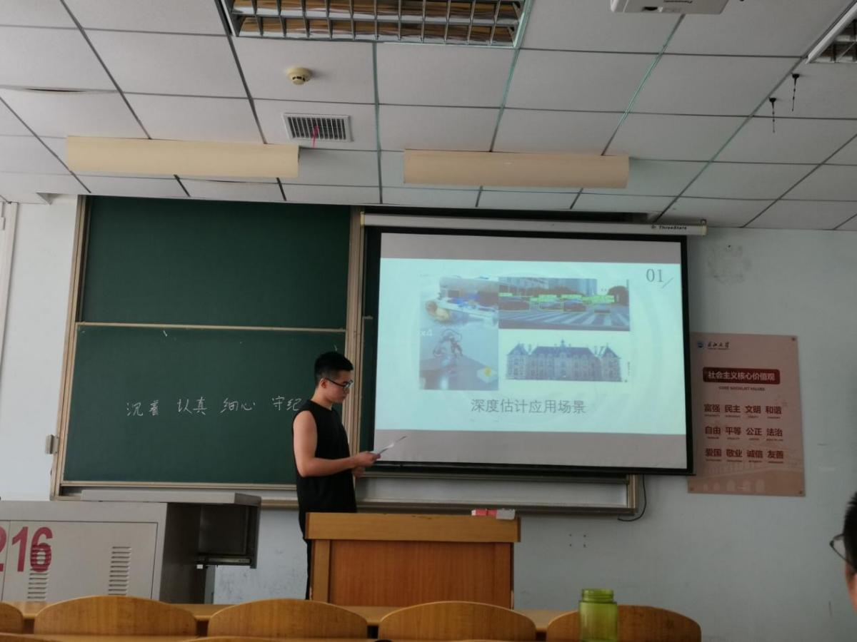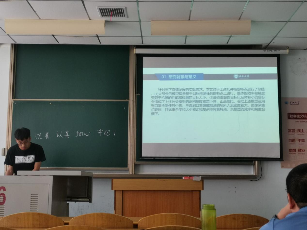 9位研究生依次登台演讲,分别围绕各自的研究方向,为同学们分享了9个课题:葡萄糖霜霉病检测分级、基于深度学习的深度估计算法研究、改进YOLOV5的口罩检测算法、基于改进YOLOV5的安全帽佩戴检测算法、牛奶智能装载算法项目设计实现、基于深度学习的教室智慧节能控制系统设计、基于时间序列的水位预测、测井曲线分层方法研究、基于顺序置乱和三角扩散的彩色图像加密算法等内容。学术论文报告会已经成为同学们知识共享和传播的一种重要方式,在演讲过程中,导师与听众和演讲人针对相关研究成果互动、探讨。每名研究生演讲完后,两位导师从全方位对演讲学生的汇报进行仔细点评,对其研究内容可能遇到的科研困难进行指导,通过点评有效促进了研究生的成长。