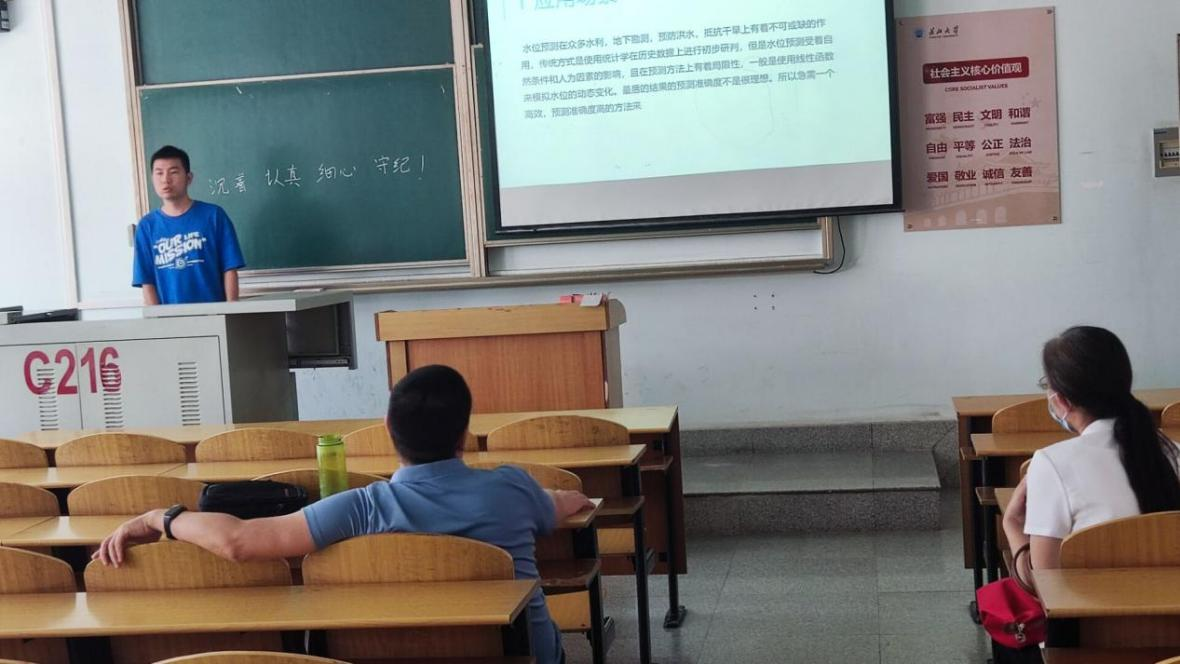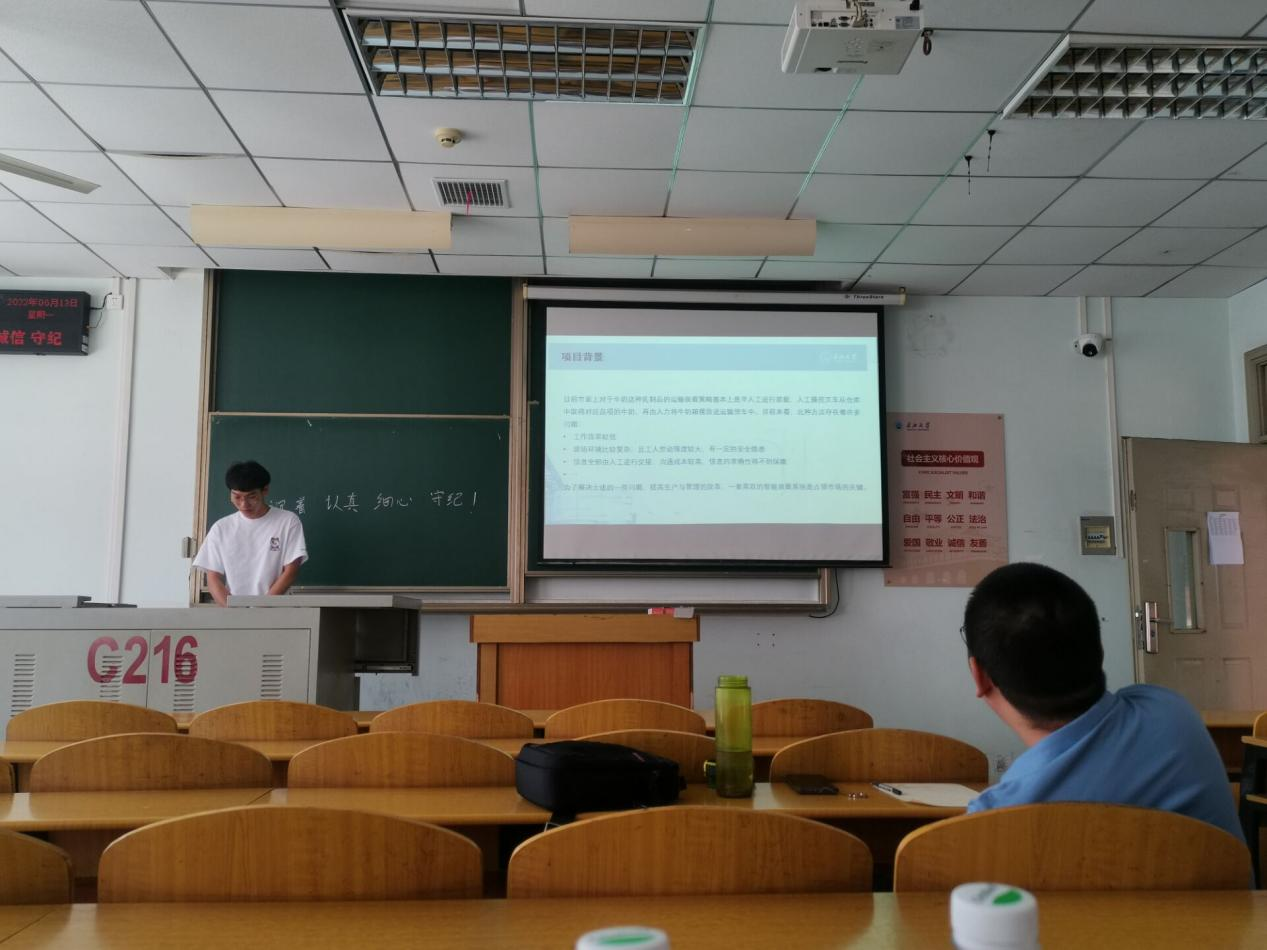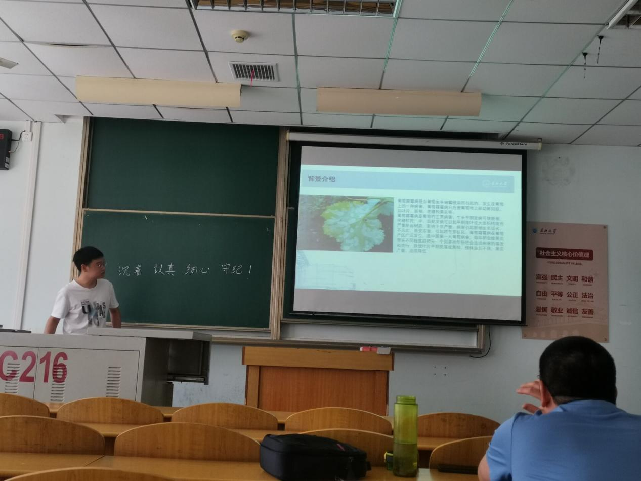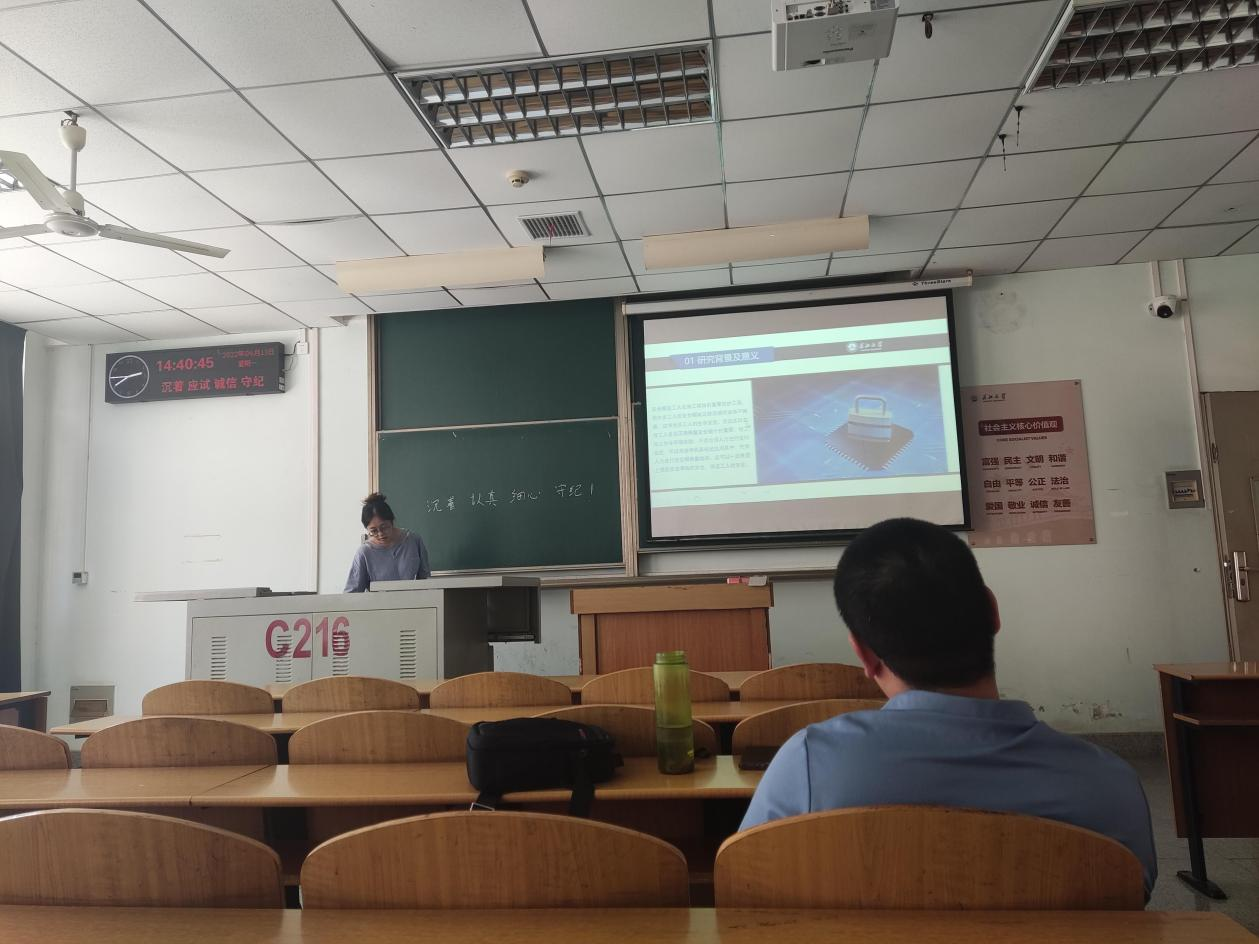 9位研究生依次登台演讲,分别围绕各自的研究方向,为同学们分享了9个课题:葡萄糖霜霉病检测分级、基于深度学习的深度估计算法研究、改进YOLOV5的口罩检测算法、基于改进YOLOV5的安全帽佩戴检测算法、牛奶智能装载算法项目设计实现、基于深度学习的教室智慧节能控制系统设计、基于时间序列的水位预测、测井曲线分层方法研究、基于顺序置乱和三角扩散的彩色图像加密算法等内容。学术论文报告会已经成为同学们知识共享和传播的一种重要方式,在演讲过程中,导师与听众和演讲人针对相关研究成果互动、探讨。每名研究生演讲完后,两位导师从全方位对演讲学生的汇报进行仔细点评,对其研究内容可能遇到的科研困难进行指导,通过点评有效促进了研究生的成长。