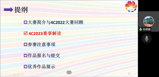彭德巍老师是中国计算机设计大赛中南赛区负责人,现任武汉理工大学计算机学院计算机科学系主任。本次讲座,彭教授主要从大赛简介与4C2022大赛回顾、4C2023赛事解读、参赛注意事项、作品报名与提交、优秀作品展示等五个方面进行了详细讲解。尤其是在4C2023赛事解读上,彭教授着重强调,今年赛事与往年相比有较大改动,比如学校上推数量限额、上推渠道优化、大赛主题发布,企业赛道增加等。同时,在参赛注意事项上,彭教授从报名比赛的资料填写、参赛过程的素材准备到现场答辩形式,从校赛到省赛再到国赛,事无巨细的给同学们进行了详细的讲解。在会议尾声,展示出往届许多优秀作品供学生们参考。在最后的答疑环节,针对同学们提出的各项疑问,彭教授也一一做了详细的讲解。