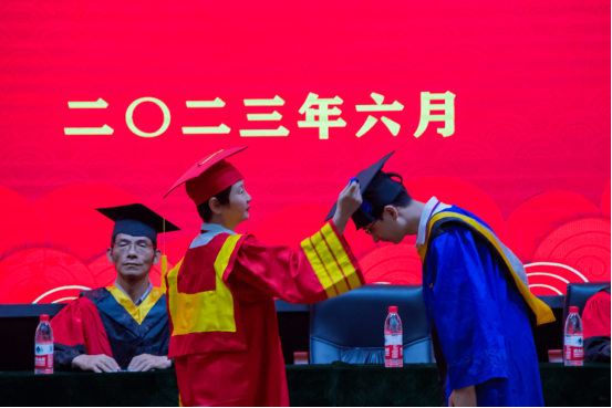 最后,毕业生学位授予仪式环节,同学们互正衣冠,陆续上台与导师握手拥抱,院长亲自为同学们拨穗,师生互道珍重并合影留恋,象征顺利毕业的导师拨穗仪式在感动中落幕。