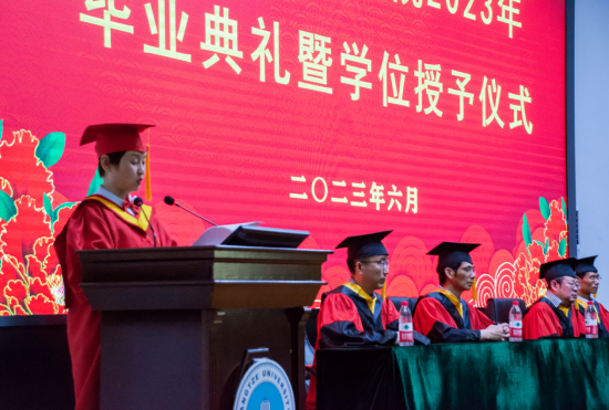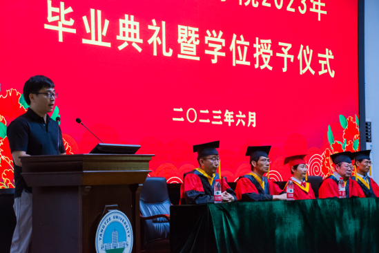 随后,学院本科、硕士毕业生代表依次上台发言。本科毕业生代表张君豪回顾了大学四年求学时光中的收获、感动与成长,并表达对各位恩师的敬爱与祝福。硕士毕业生代表孙立超将懂感恩、守初心与再奋斗的情感用“春蚕到死丝方尽,蜡炬成灰泪始干”、“天行健,君子以自强不息;地势坤,君子以厚德载物”、“不忘初心,砥砺前行”三句名言表达,并祝愿“母校桃李芬芳,学院再创辉煌”。