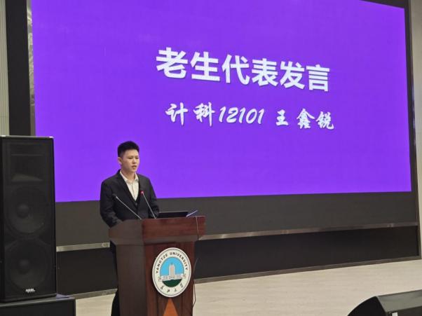 高年级学生代表王鑫锐同学,结合自己在学院的学习经历,向新生建议尽早做好大学规划,朝着感兴趣的方向奋斗,终将收获美好的结果。新生代表成贝尔迅同学倡议大家尽快转变角色,适应大学生活,始终保持对专业的热情,对新技术的好奇,以不甘落后的心态去不断更新自我。