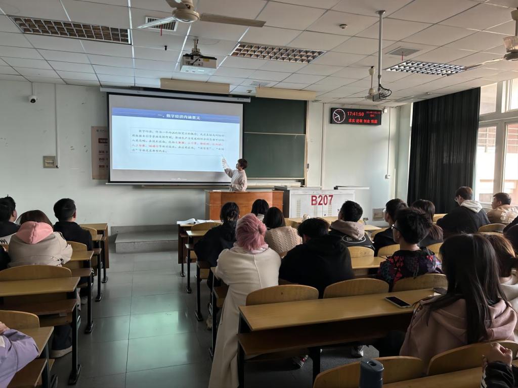 院长崔艳荣在13教B207教室以《包容创新,让数字经济引领高质量发展》为题作形势政策报告,学院2023级学硕研究生参加了此次会议。
