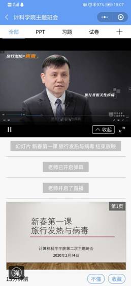 采用雨课堂平台召开了本学期第二次全体学生网络班会,共同观看学习张文宏教授的微课堂:新春第一课《旅行发热与病毒》。学院党委副书记颜学俊、全体辅导员、部分班主任及2000余名本科生、研究生通过网络参加了本次学习。