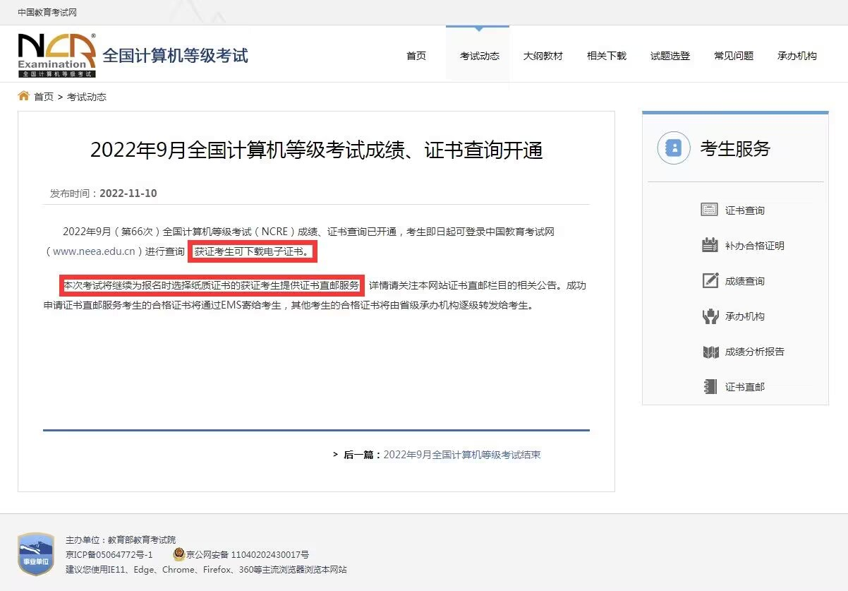 现已在中国教育考试网面向考生开通2022年9月全国计算机等级考试成绩查询和证书查询及电子证书下载,对获证且报名时选择“纸质证书+电子证书”的考生开通证书直邮申请服务。